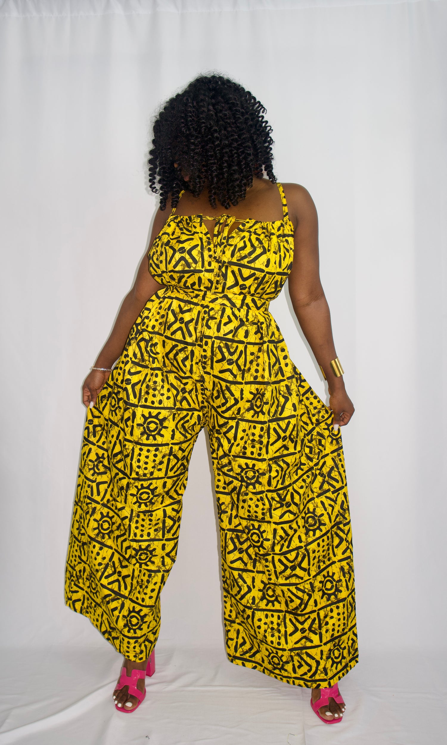 Tush Jumpsuit blends traditional Ankara fabric with a modern style, featuring Open shoulder, Wide free-flowing legs and a Belt