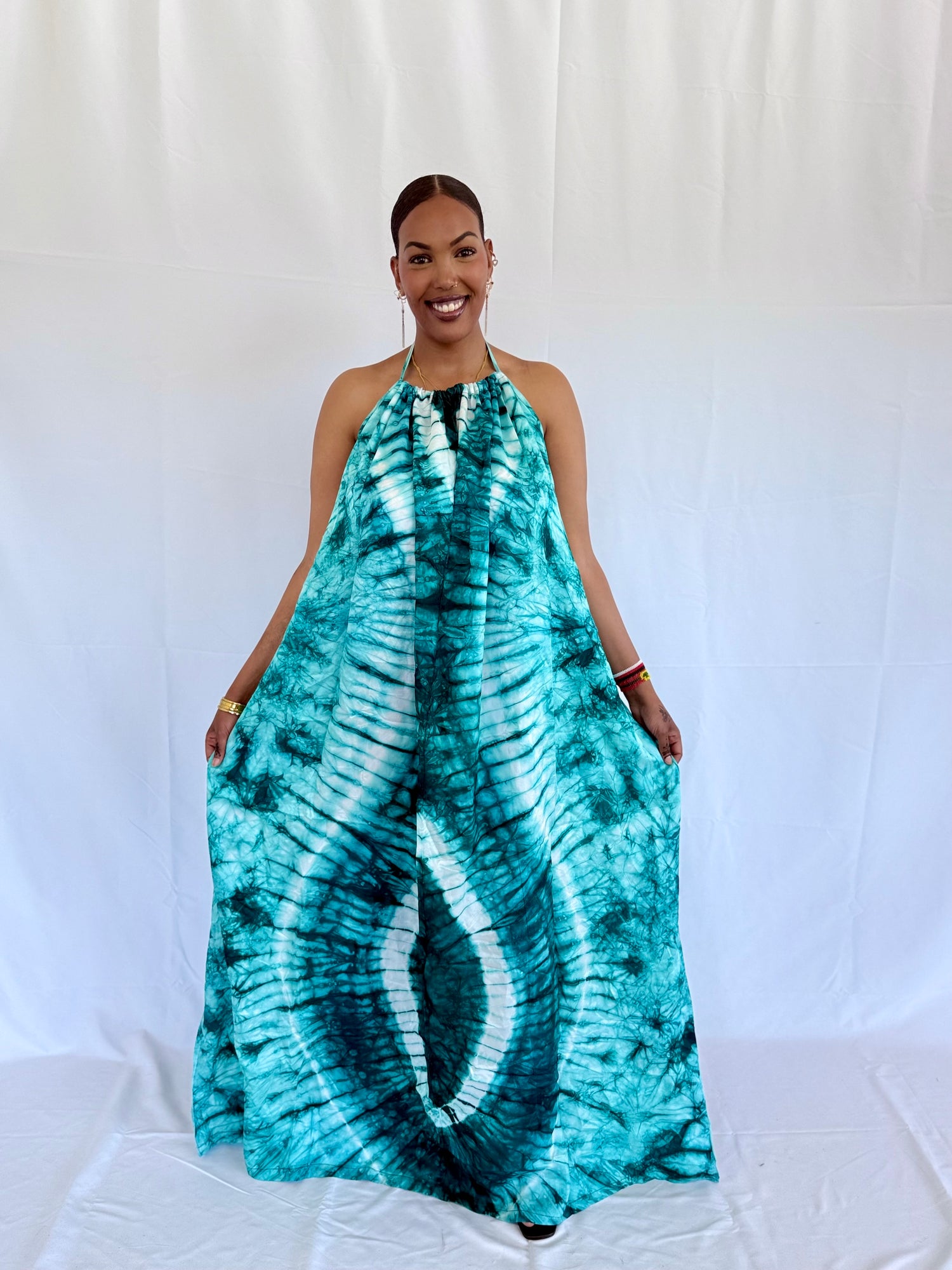 Wura Gown is crafted from hand-dyed Adire fabric. Featuring halter neckline, open back and free flowing full length drape