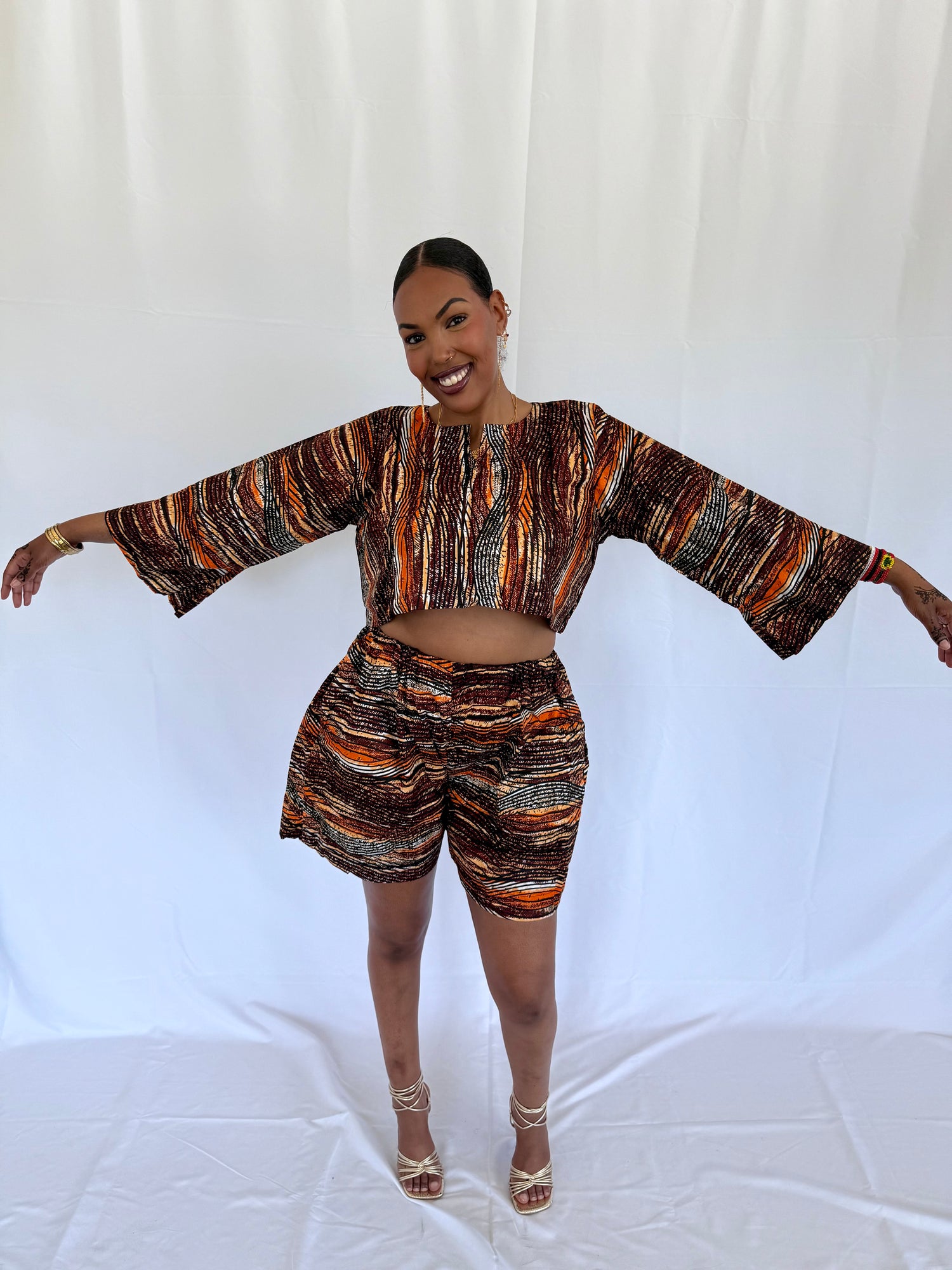 Made from vibrant Ankara fabric, this 2-piece set includes a cropped long-sleeve top with a notched neckline and High-waisted tailored shorts